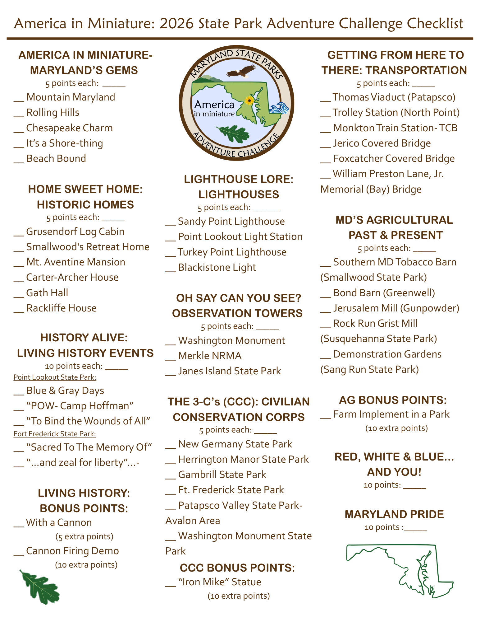 Once you receive your confirmation number and have completed enough challenges to reach 250 points, you will fill out the form below. One entry per person, please. Tally up your points on your own, or use our worksheet to keep track of your travels. You may participate as a team, but in order to receive prizes each participant should complete the form with their own confirmation number. You will need to provide photos (proof of points) if selected for one of the prize drawings. Prize drawings will be held on November 18, 2026 at Noon. Prize drawings will include gift certificates for camping and cabin stays, as well as a 2027 Maryland State Parks Annual Pass.