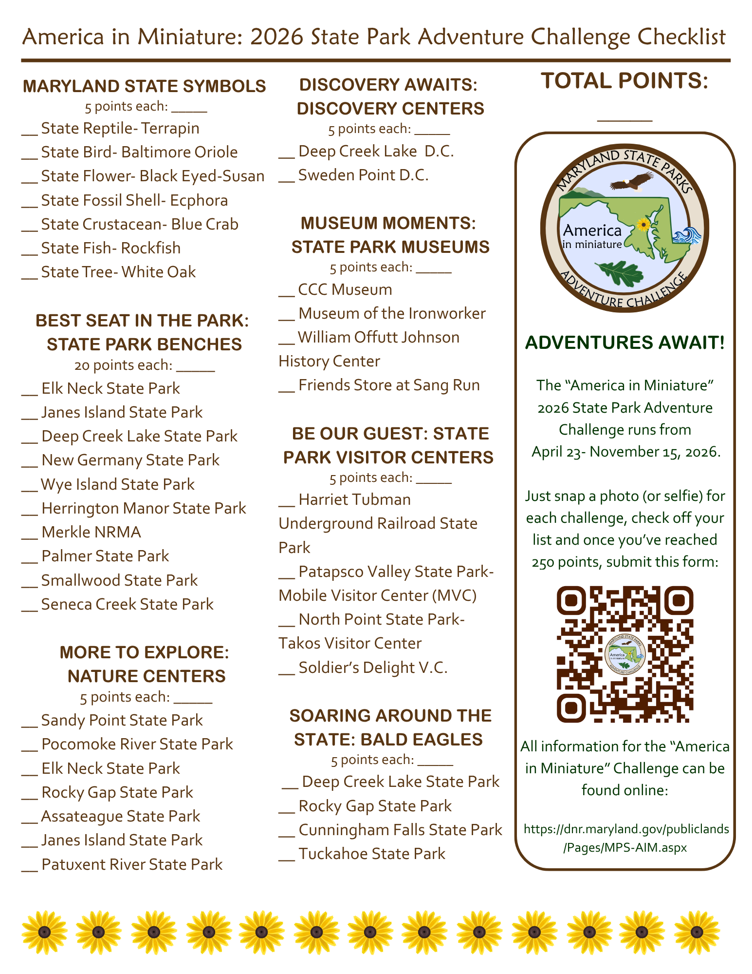 *Most Maryland State Parks are open from sunrise to sunset, however hours may vary for specific locations, such as Nature Centers, Visitor Centers and the historic structures. Please contact the park directly to determine if the specific area you plan to visit will be open. You may also take photos outside of structures to complete these challenges.