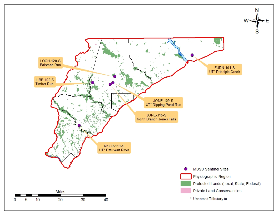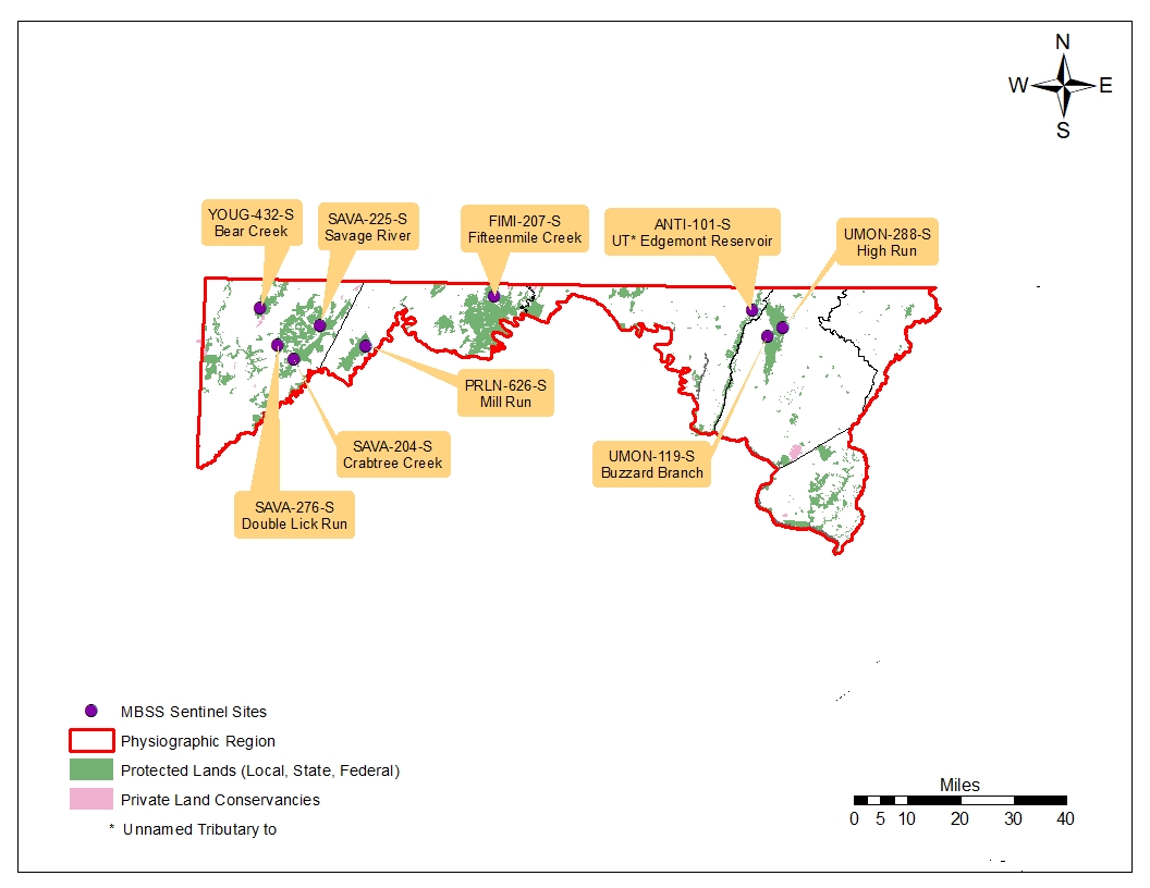 The Maryland Biological Stream Survey (MBSS) has collected biological, physical, and chemical data at sites within the Maryland Sentinel Site Network since 2000 (some sites as early as 1995). This network includes 30 minimally degraded stream sites located in four regions across the state (Eastern Coastal Plain, Western Coastal Plain, Eastern Piedmont, and Highlands). Monitoring of these sites allows MBSS to better understand natural conditions of Maryland streams by region and how these conditions vary annually. Data from these sites can also be used in comparison with degraded streams throughout the state to determine which annual differences are the result of natural variation versus those potentially resulting from anthropogenic influence.